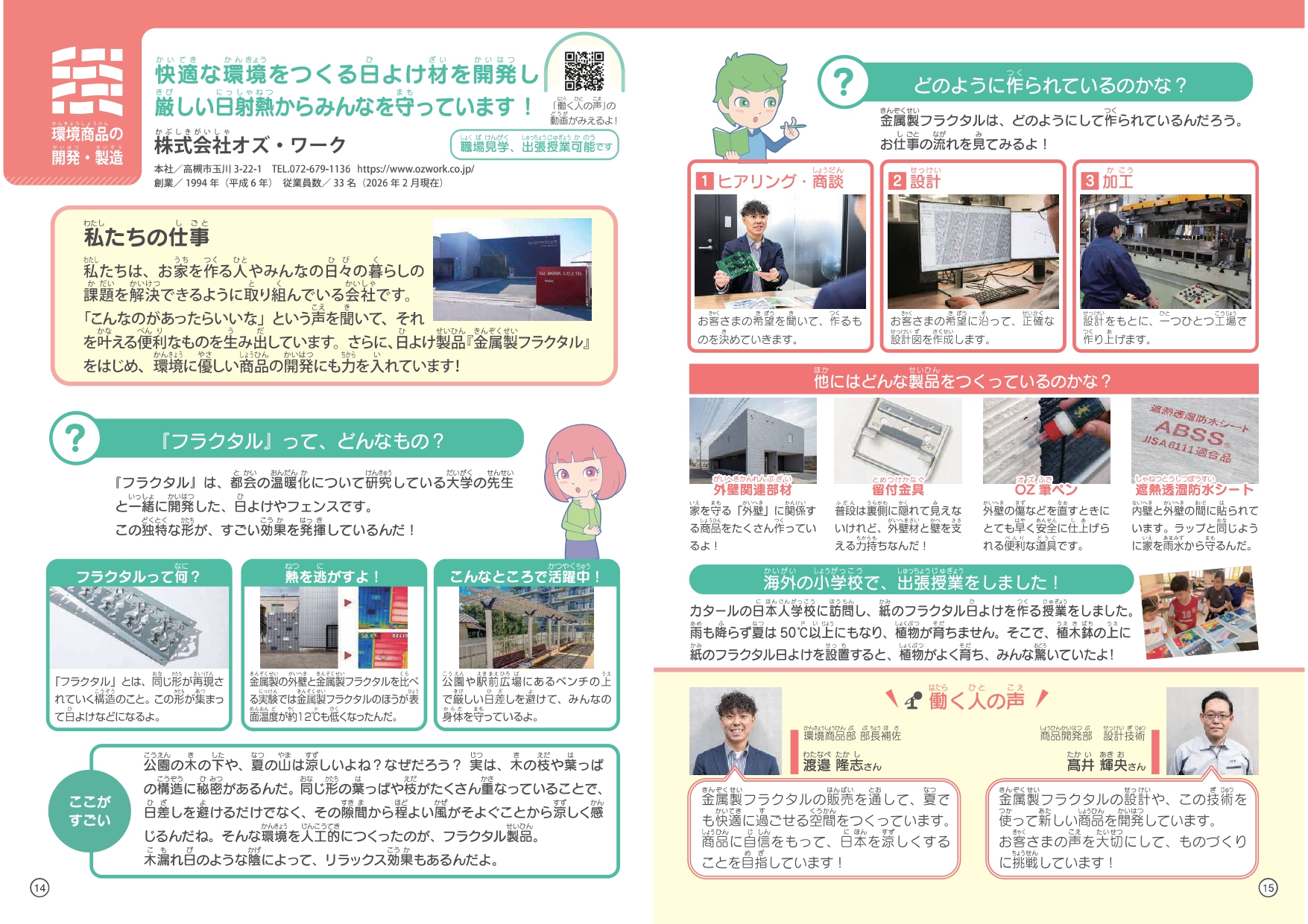 小学校中学年に配布される本誌では、当社の事業や金属製フラクタル製品・外壁関連部材について、わかりやすく紹介しております。